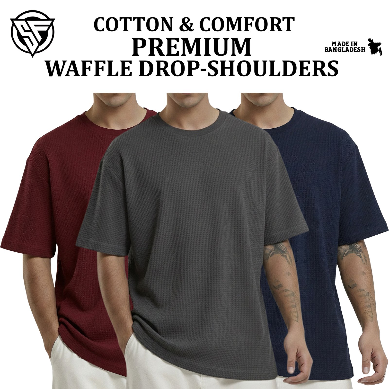 Premium Waffle Drop Shoulder Maroon-Charcoal-Navy Blue